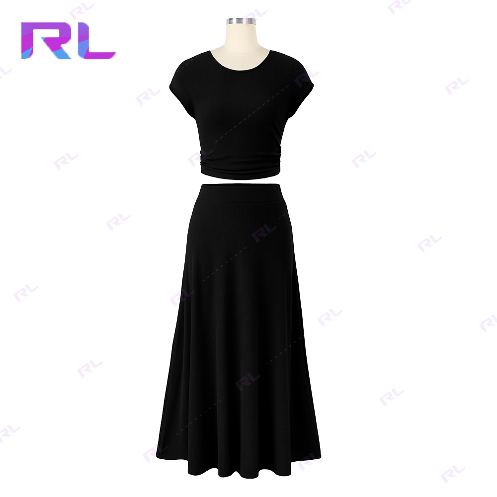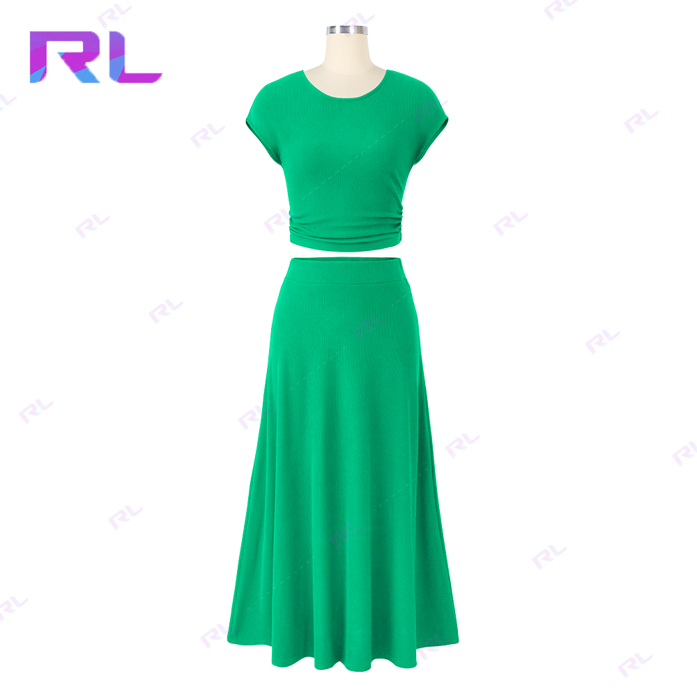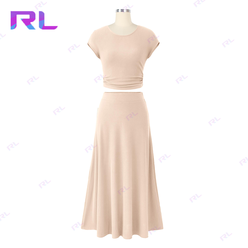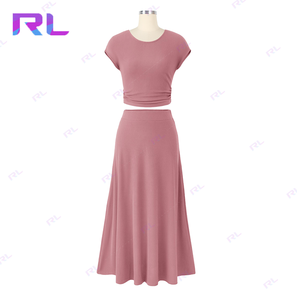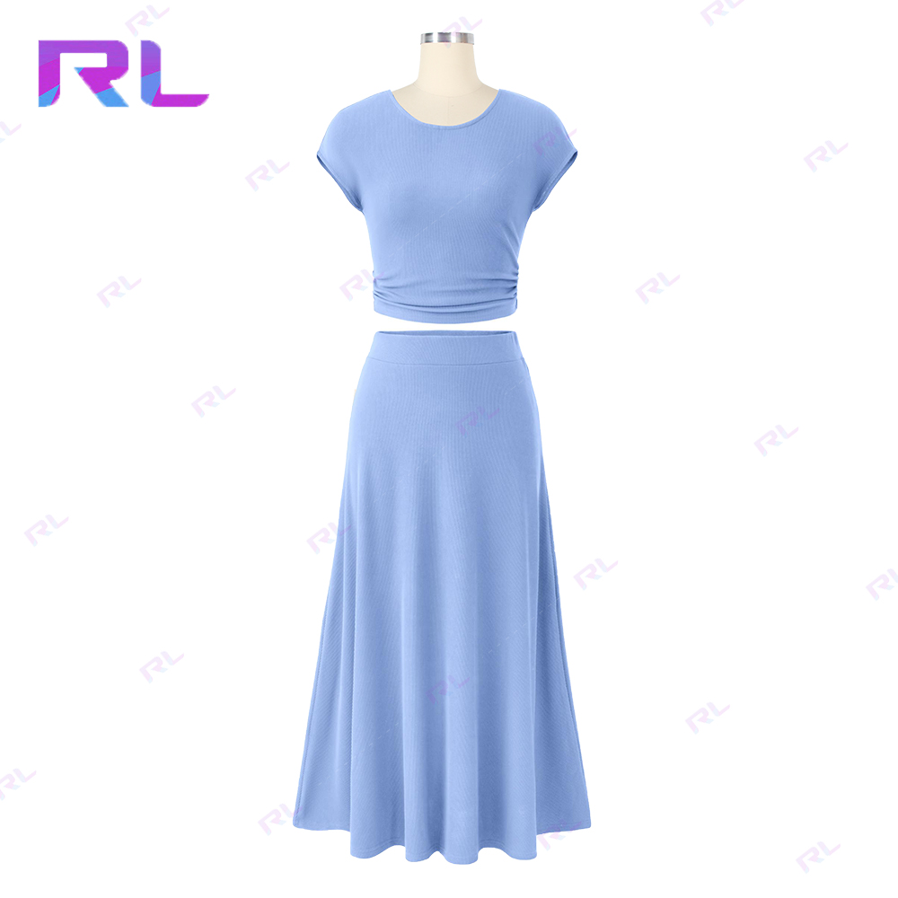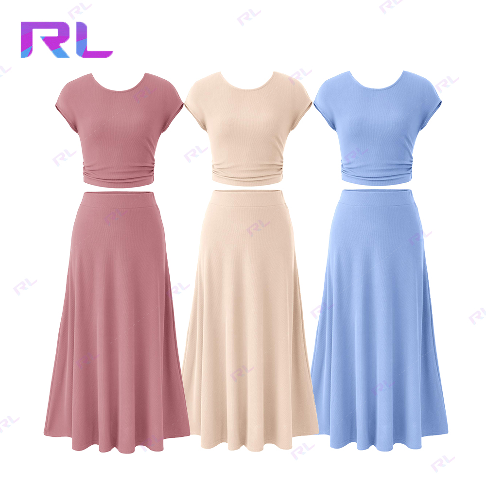 Women Two Piece Skirt Set Casual Ribbed Knit Crew Neck Short Sleeve Cropped Top Elastic Waist Swing Midi Skirts