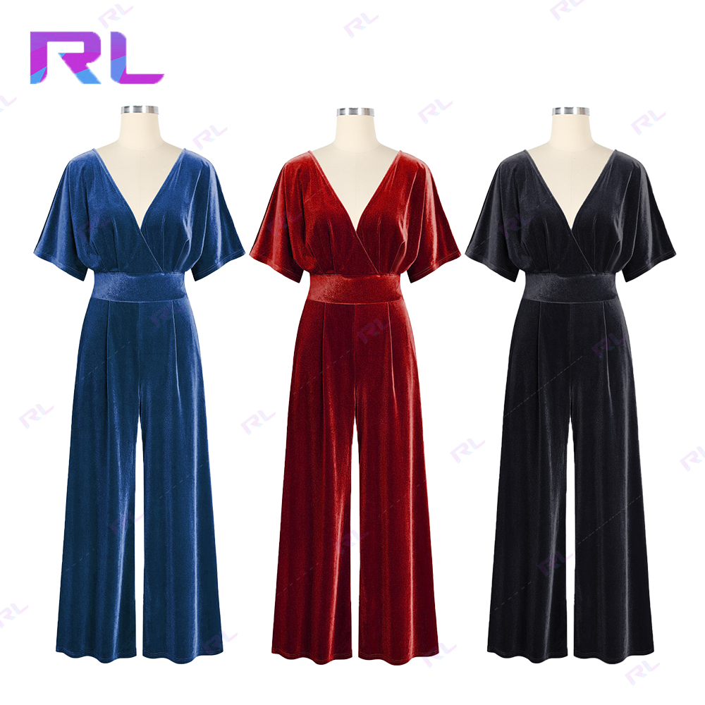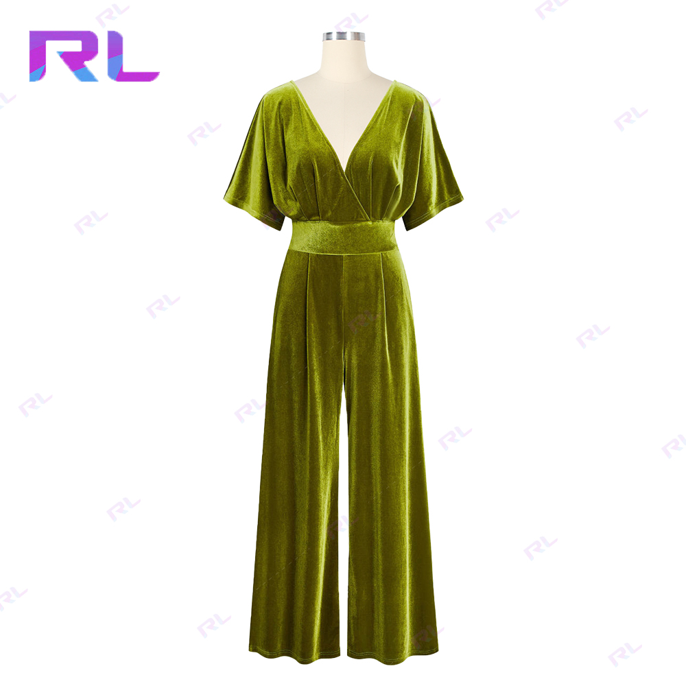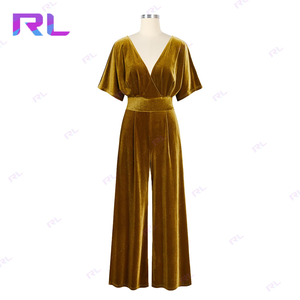 New arrival casual v neck short sleeve jumpsuit belted long wide leg pant one piece Solid Color Gold Velvet women rompers